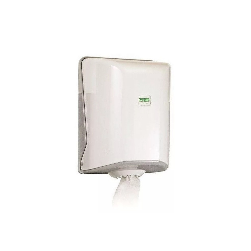 Vialli tekercses kéztörlő adagoló. 19 cm átmérőjű belső mag adagolású papír kéztörlővel használható. Az adagoló nyílása tépőfogakkal van ellátva, így perforált és perforáció nélküli papírral is használható.