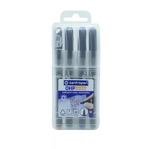 Írásvetítő fólia, fólia, műanyag, üveg, fém, fa, szinte minden felület feliratozására, jelölésére alkalmas, OHP-permanent festékkel töltött marker, műanyag foglalatú írócsúccsal. Gyorsan száradó, színtartó festék, írásképe törlés- és vízálló. A festék nagy fényáteresztő képességgel rendelkezik, ami vetítés során kontúros és színhelyes visszaadást tesz lehetővé. Vonalvastagság: 1 mm, hegyvastagság 2,5mm. Alkoholos filc. Szürke műanyag test, klipszes kupak. Katalóguskód: 23304