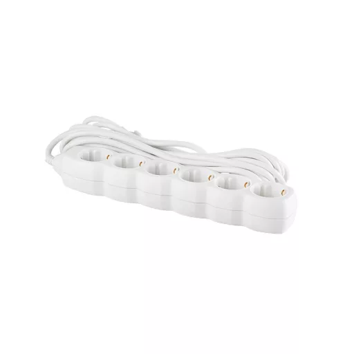 Beltéri hosszabbító, elosztó hat csatlakozó aljzattal 5m hosszúkábellel. Kábel: H05VV-F 3G1,0mm Fehér 6-os elosztó Katalóguskód: 14478