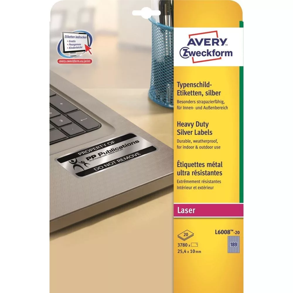 Címke mérete: 25,4 x 10 mm Doboz tartalma: 3780 címke címke - 20ív/doboz (189 címke/ lap) Ezüst poliészter címke, strapabíró időjárásálló címkéi lézernyomtatókhoz kifejezetten a tulajdon tárgyaink megbízható és professzionális felcímkézéséhez fejlesztve készültek. A strapabíró, poliészter filmből készült etikettek olaj, szennyeződés-, UV- és hőállóak (-40°C és +150°C között), vízállóak és szakadásbiztosak. Az ezüst ipari etikettek tökéletesek például vállalatok tulajdonainak, elektronikai berendezéseinek és azok alkatrészeinek felcímkézésére. Tervezze meg és nyomtassa ki ezüst ipari címkéit gyorsan és egyszerűen - ingyenes szoftverünkért és sablonjainkért látogasson el a http://www.avery.hu/templates-software/ weboldalra vagy használja a Microsoft® Office csomagokba beépített sablonjainkat! Kifejezetten lézernyomtatókhoz fejlesztve.Katalóguskód: 25337