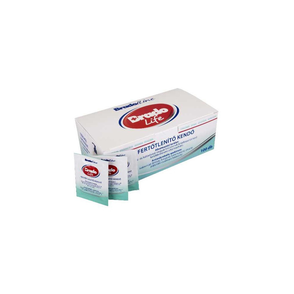 Bradolife fertőtlenítő kendő 100db. Alkalmazási terület: Kéz-és különböző tárgyak felületének letörléssel történő fertőtlenítésére alkalmazható. Antimikrobális spektrum: baktericid (MRSA), fungicid, tuberkulocid, virucid (HBV/HIV inaktiváló hatású is).