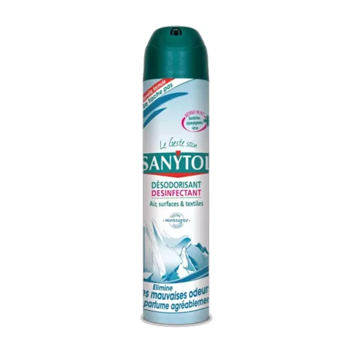 A Sanytol, a klórmentes fertőtlenítés szakértője kifejlesztette fertőtlenítő légfrissítő aeroszolját, mely biztosítja Önnek a tökéletes higiéniát és kellemes illatot varázsol környezetébe. Egyedülálló összetételének köszönhetően semlegesíti a kellemetlen szagokat és elpusztítja a felületeken és textíliákon megtelepedett kórokozók 99,9%-át. Fertőtlenít és tisztít. Semlegesíti és eltünteti a szagokat. Nem károsítja a felületeket. Kellemes hegyi levegő illatú.