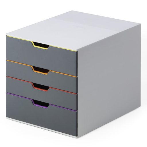 Vonzó, innovatív fiókos irattároló, 4 színes fiókkal, 2 XXL fiókkal, mely extra nagy tárolási lehetőséget biztosít. Prémium minőségű műanyagból. Minden fiók színkóddal ellátott, így könnyebb rendszerezni a dokumentumokat. A fiókok könnyen és halkan nyílnak. A megállító mechanizmusnak köszönhetően nem lehet őket kirántani. Alkalmas A4, C4 és levél formátumok tárolására. A tároló feliratozható, áttetsző nyitókkal rendelkezik. Az irattárolók biztonságosan egymásra tehetők a csúszásmentes talpnak köszönhetően. Az irattárolók egymás mellé is elhelyezhetők, irodában, szekrényekben. Méret: 280 x 292 x 356 mm Katalóguskód: 24877