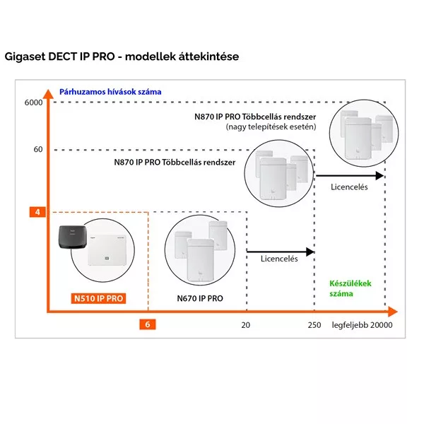 Az N510 IP PRO egycellás rendszer nem fejleszthető nagyobb DECT rendszerré – például mini-többcellás, vagy többcellás rendszerré –, mint az N670 IP PRO egycellás DECT rendszer.
