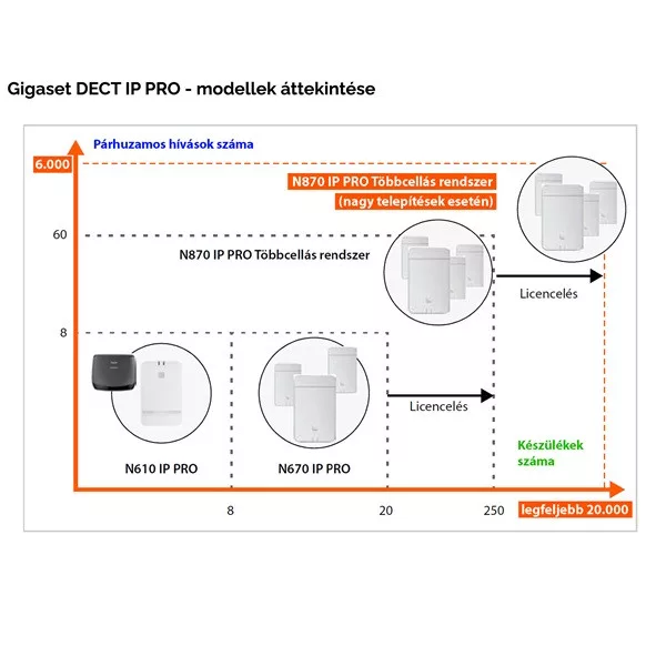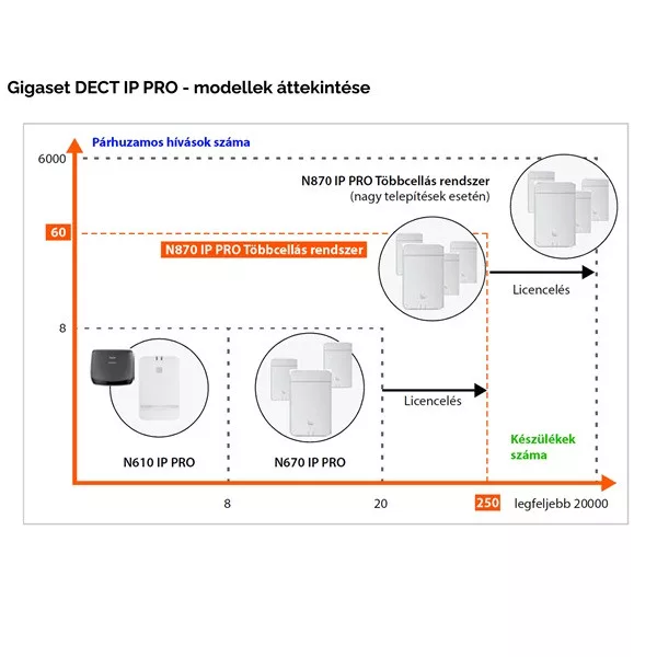 N870IP PRO skálázhatóság: minden egyes N870IP PRO rendszer a DECT Menedzser üzemmódban 250 kézibeszélő/SIP fiók/felhasználó, 60 bázisállomás és 60 párhuzamos hívás (10 egyidejű hívás bázisonként) üzemeltetésére képes. További licenckulccsal („Virtual Integrator SW license”) nagy rendszerré bővíthető: akár 6.000 bázisállomással, 20.000 kézibeszélővel (telefonnal) és 6.000 egyidejű hívással.