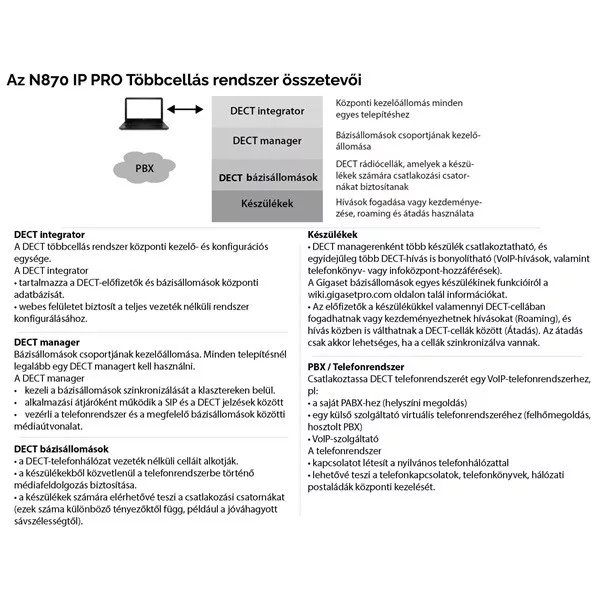 All-In-One – Egyetlen Hardware Koncepció: az N870 IP PRO készülék egyben tartalmazza a DECT menedzser és a DECT bázisállomás funkciókat is. A beállítások során mi dönthetjük el a szükséges funkció szerinti beállítást.