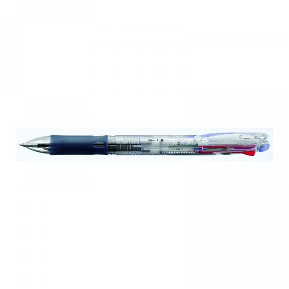Négy funkciós golyóstoll, de a toll teste mégis vékony, gumírozott fogórész, csipeszes klipsz , alapanyagának 74%-a újrahasznosított anyagokból származik. Írás színe kék+piros+fekete+zöld. Betét SK.10db/gyűjtő, 1000db/karton. Katalóguskód: 800