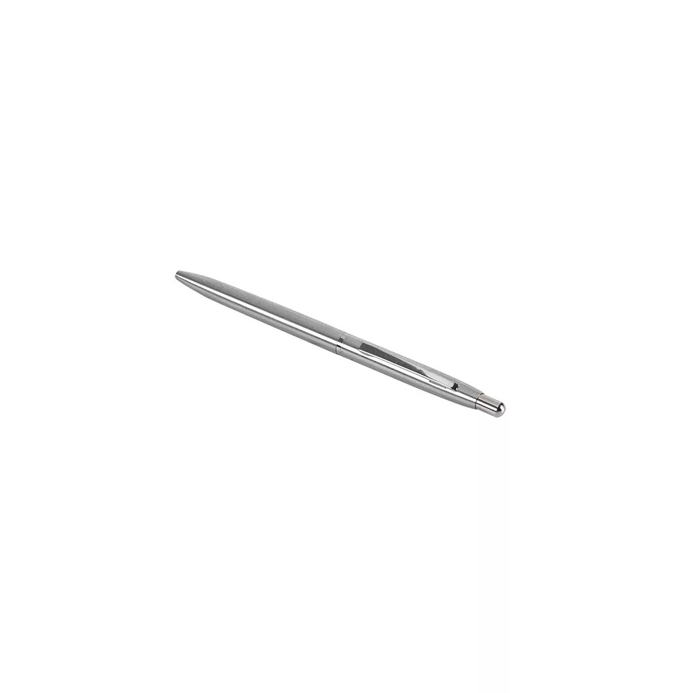 Nyomógombos mechanikával működő golyóstoll, cserélhető nagytartályos golyósbetét. Gravírozható fém tolltest, fém kiegészítők. Írásszín: kék. Vonalvastagság: 0,8 mm. Íráshossz: 5000 m. Katalóguskód: 19506