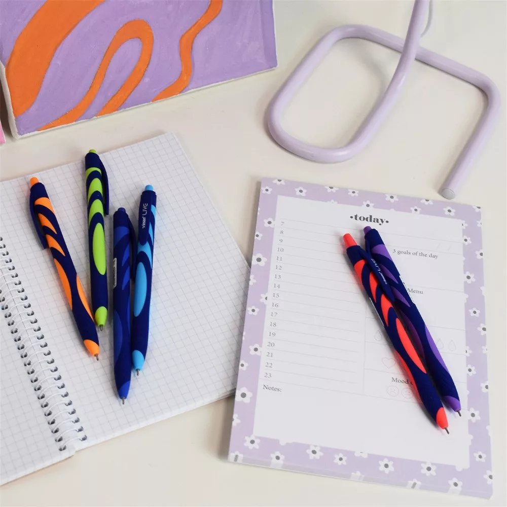 Vinson F20 Live nyomógombos, csúszásmentes gumírozott testű golyóstoll. A betét kék színű olajzselés tintát tartalmaz, mely könnyű gördülékeny írást tesz lehetővé. Nem cserélhető betétes. Vegyes neon színű külső testtel. Kiszerélés: 36 db/display.
