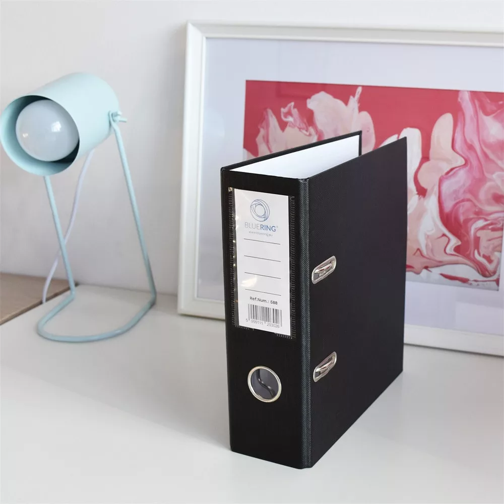 Emelőkaros iratrendező általános használatra. Kívül PP, belül fehér karton borítással, kihúzólyukkal. Cserélhető gerinccímke a feliratozáshoz. Tárolókapacitás 500 lap (A5 80gr.). A terméket lapra szerelve szállítjuk, a mellékelt emelőkaros szerkezet bepattintása gyors és egyszerű, 5 másodperc alatt elvégezhető és iratrendezőnk máris használatra kész! Katalóguskód: 39180