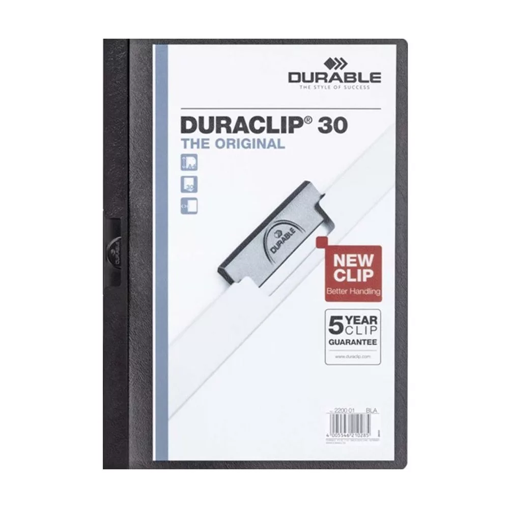 Az eredeti DURACLIP® mappa PVC-ből készült, speciális rugalmas acél klippel. Ideális prezentációk, iratok, ajánlatok, konferenciák / szemináriumok jegyzeteinek vagy riportoknak lyukasztás nélküli lefűzérésre. A DURACLIP® 30 kapacitása 30 db A4 lap. Áttetsző előlappal és színes hátlappal. További kiegészítők kaphatók. Saját logojával nyomtatva a DURACLIP® egy egyedi hirdetési eszközzé változik. A DURACLIP® speciális, egyedi színben is le tudjuk gyártani. A DURACLIP® rendszer: húzza ki a klippet, helyezze be a dokumentumokat, és nyomja vissza a klippet. Egyszerű! Az egyedülállóan rugalamas acél újra-és-újra visszanyeri eredeti formáját. Kérjük vessen egy pillantást a www.duraclip.com weboldalra is. Katalóguskód: 24862