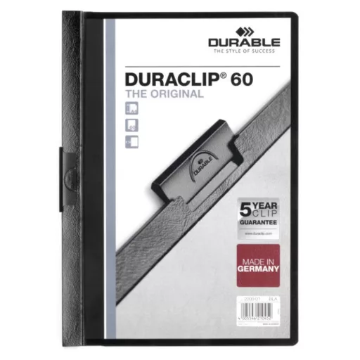 Az eredeti DURACLIP® mappa PVC-ből készült, speciális rugalmas acél klippel. Ideális prezentációk, iratok, ajánlatok, konferenciák / szemináriumok jegyzeteinek vagy riportoknak lyukasztás nélküli lefűzérésre. A DURACLIP® 60 kapacitása 60 db A4 lap. Áttetsző előlappal és színes hátlappal. További kiegészítők kaphatók. Saját logojával nyomtatva a DURACLIP® egy egyedi hirdetési eszközzé változik. A DURACLIP® speciális, egyedi színben is le tudjuk gyártani. A DURACLIP® rendszer: húzza ki a klippet, helyezze be a dokumentumokat, és nyomja vissza a klippet. Egyszerű! Az egyedülállóan rugalamas acél újra-és-újra visszanyeri eredeti formáját. Kérjük vessen egy pillantást a www.duraclip.com weboldalra is. A klippre 5 év garanciát vállalunk! Katalóguskód: 24867