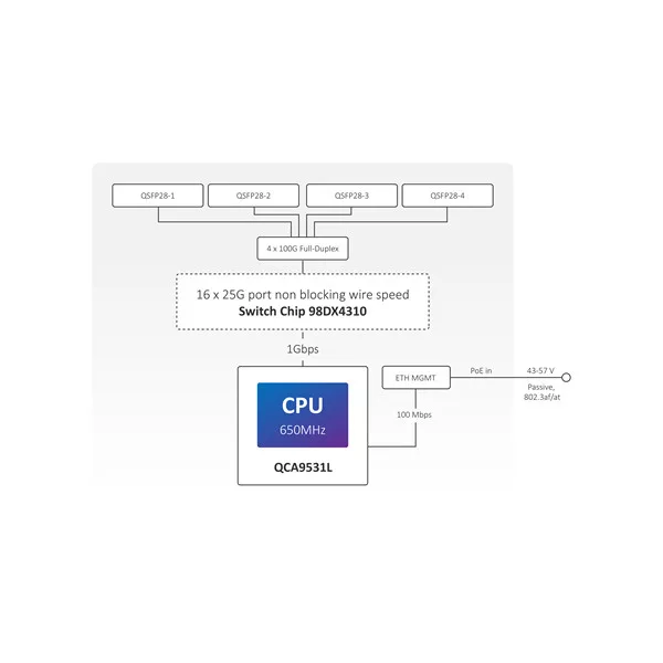There are four 100 Gigabit QSFP28 ports. Use them to connect other 100 Gigabit devices or grab a breakout cable to connect multiple 25 Gigabit devices: each port is connected to four 25 Gigabit lines, allowing you to connect 16 x 25 Gigabit devices. In fact, you can mix and match all kinds of connections this way: 100 Gigabits on one port, 40 Gigabits on the other, 4x25 Gigabits on the third, and maybe even some 10G or 1G cables on the fourth. Obviously, there is an Ethernet port for management purposes as well.