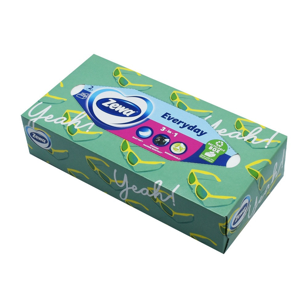 Jó választás a család minden tagjának: az új Zewa Everyday dobozok megbízhatóan jó minőségű papír zsebkendőt kínálnak. Orrfújáshoz, kozmetikai felhasználásra, kéztisztításra, gyümölcsök letörlésére... nincs olyan feladat a mindennapokban, amelyre ne tudnának megoldást. A dobozokat színes, vidám, könnyed design teszi mindenki kedvencévé.