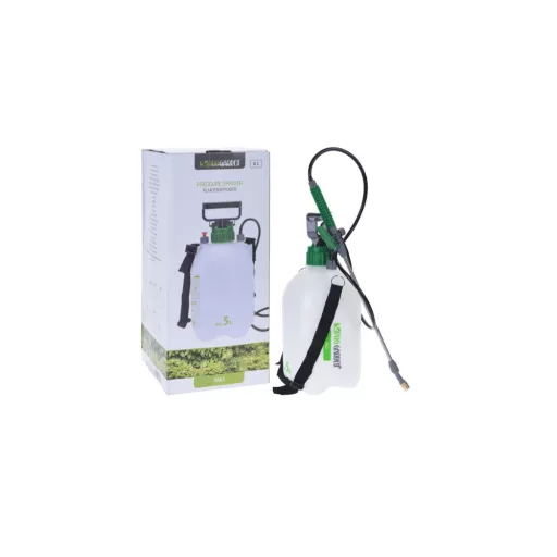 5 literes túlnyomásos permetező vállpánttal, állítható fejjel, 30 cm hosszú fém szárral, 120 cm csővel.