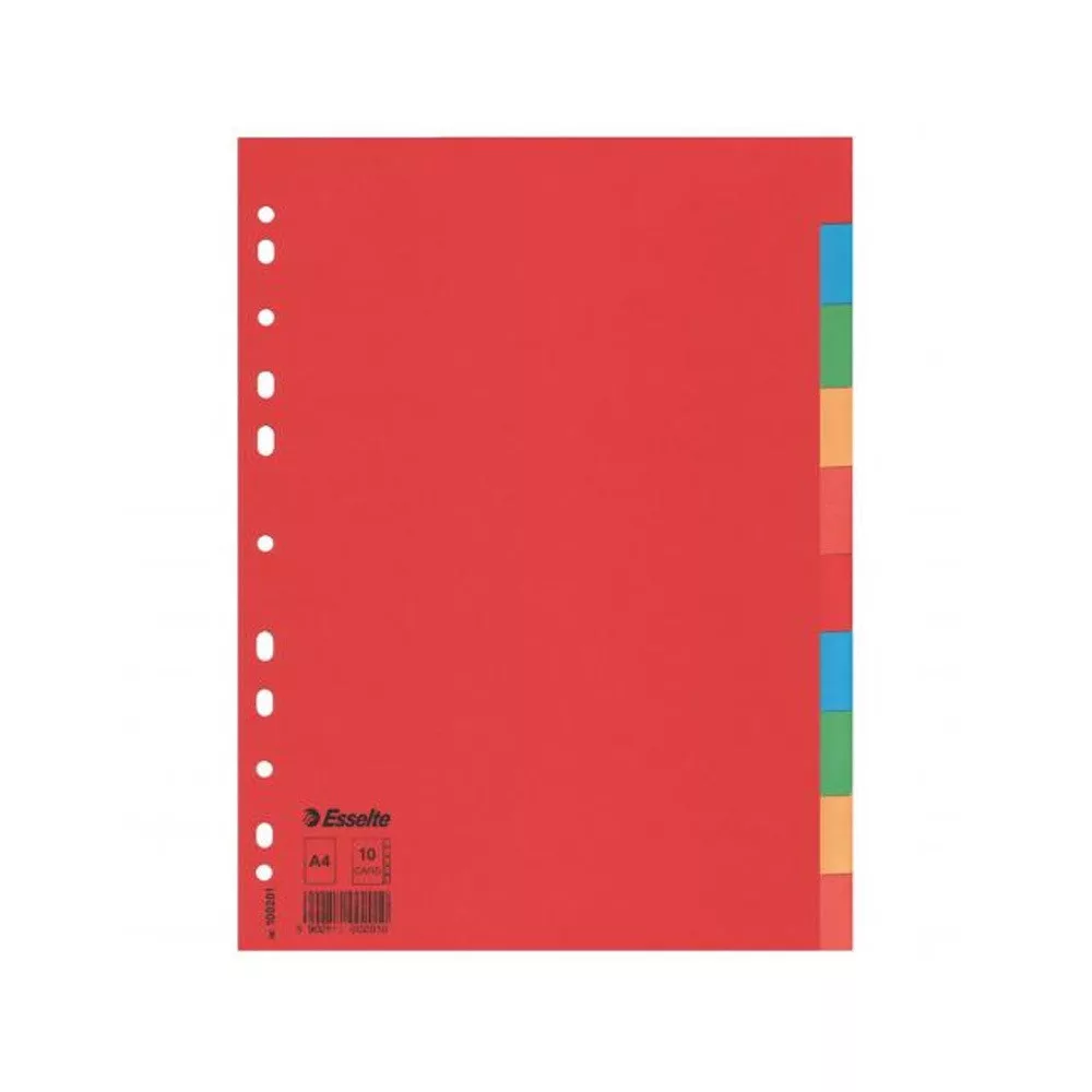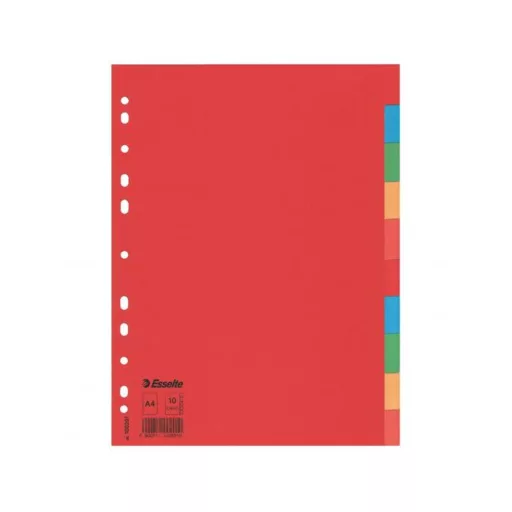 Tartós elválasztólap élénk színkombinációkban. Újrahasznosított karton alapanyag. 10 színes fül a könnyű rendszerezéshez Hagyományos, 11-lyukú lefűzőrész A4 formátum Erős, 160 g-os karton alapanyag Blue Angel minősített, újrahasznosított karton alapanyag Katalóguskód: 35868