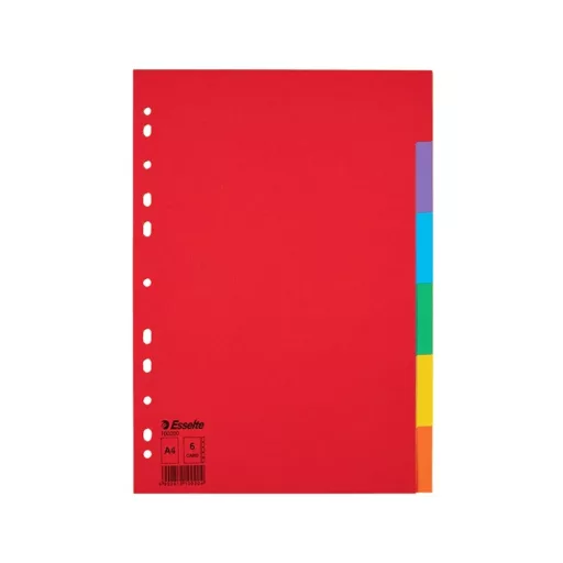 Tartós elválasztólap élénk színkombinációkban. Újrahasznosított karton alapanyag. 6 színes fül a könnyű rendszerezéshez Hagyományos, 11-lyukú lefűzőrész A4 formátum Erős, 160 g-os karton alapanyag Blue Angel minősített, újrahasznosított karton alapanyag Katalóguskód: 35867