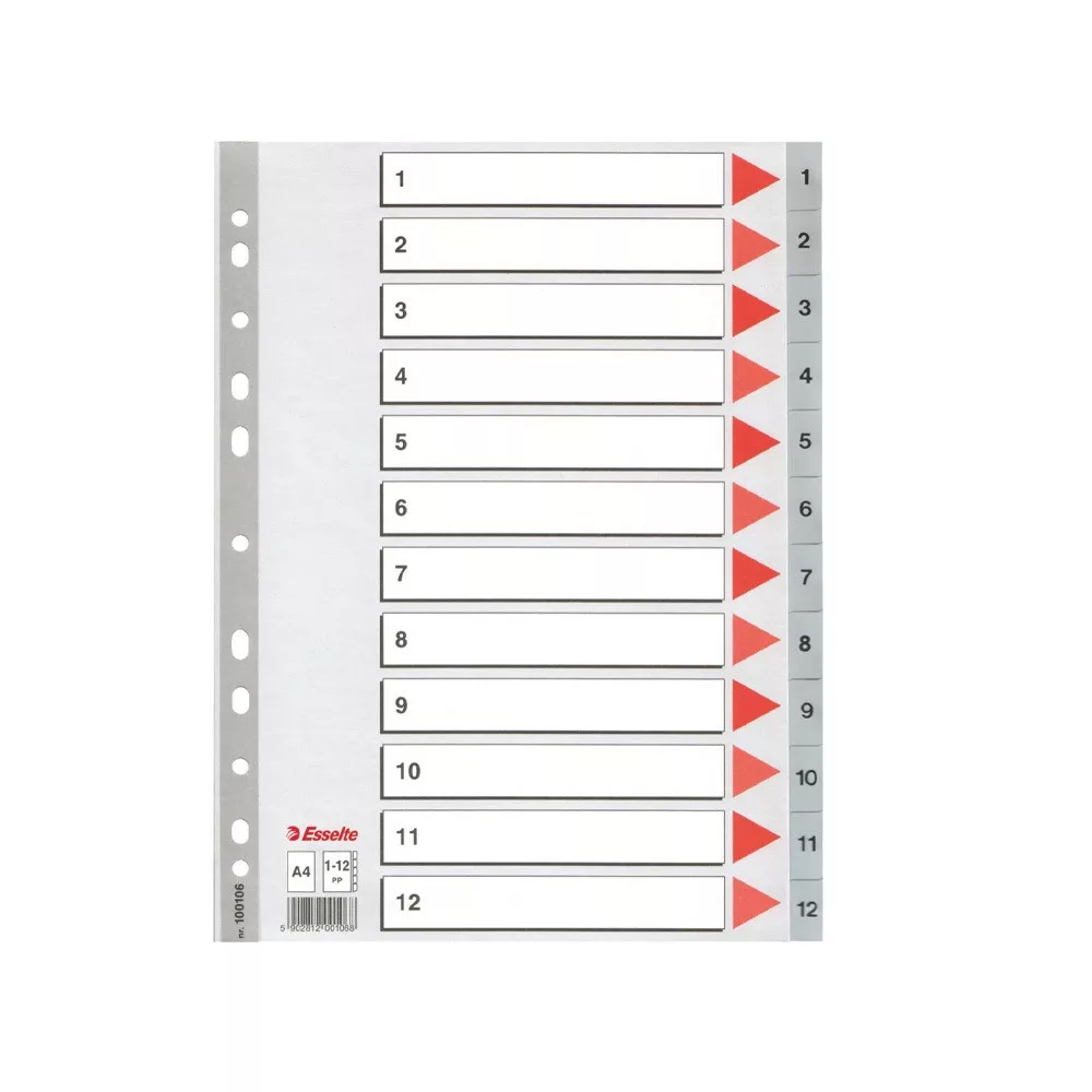 Szürke színű regiszter. Nagyméretű téglalapok az előlapon a tartalom feltüntetésére. Megerősített lefűzőrész az előlapon 1-12 felirattal rendelkező regiszter fülek a dokumentumok gyors eléréséhez Hagyományos, 11-lyukú lefűzőrész A4 méret 0,12 mm vastag PP alapanyag Katalóguskód: 35874