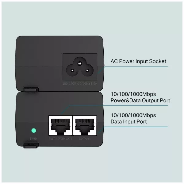 1x10/100/1000Mbps RJ45 data-in port, 1x10/100/1000Mbps RJ45 power+data-out port