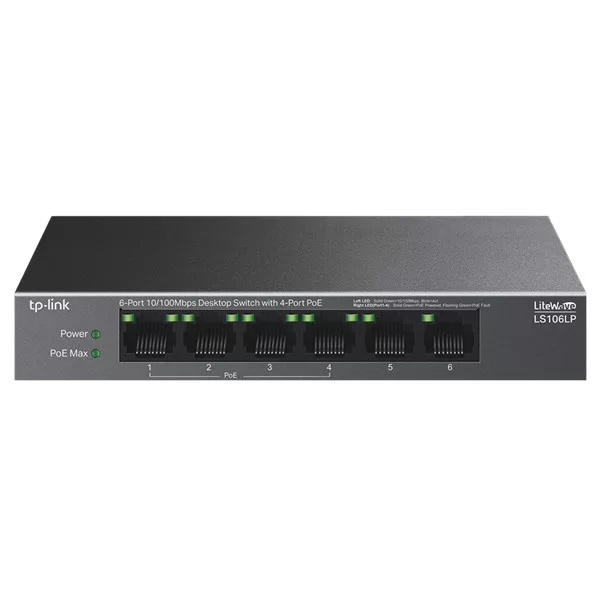 TP-LINK Switch 6x100Mbps (4xPOE) Fémházas Asztali, LS106LP
