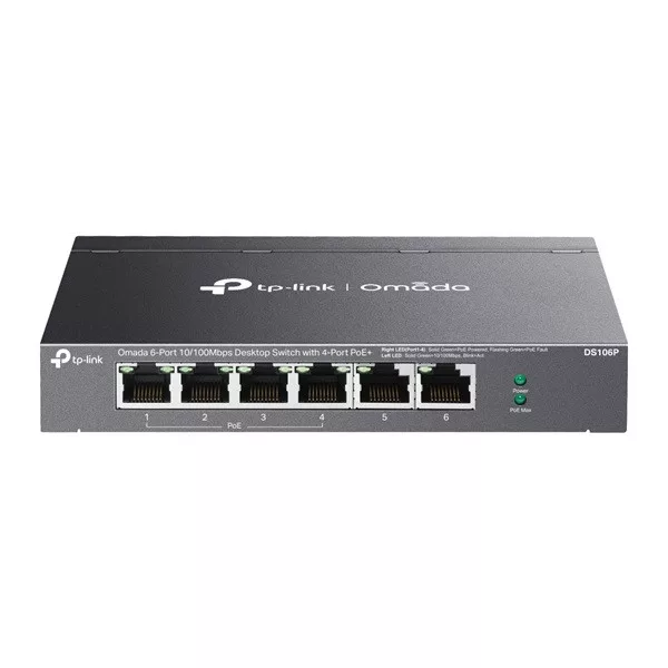 TP-LINK Switch 6x100Mbps(4xPOE+) Fémházas (Omada), DS106P