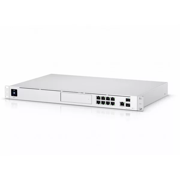 The UDM Pro is an all-in-one networking console that runs every UniFi OS application, like Network and Protect. It features a built-in security gateway, 10G SFP+ WAN support, an 8-port Gigabit switch, and network video recorder that supports compatible 3.5" hard disk drives (HDDs).