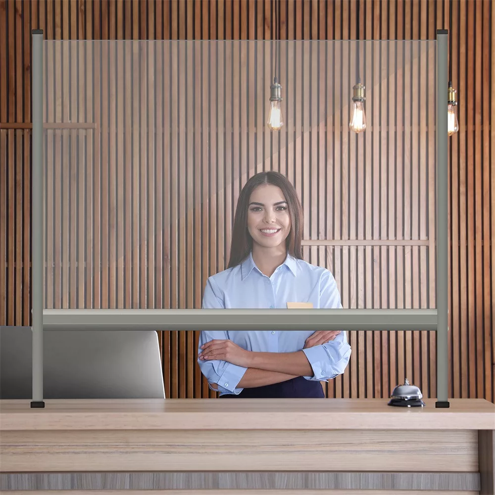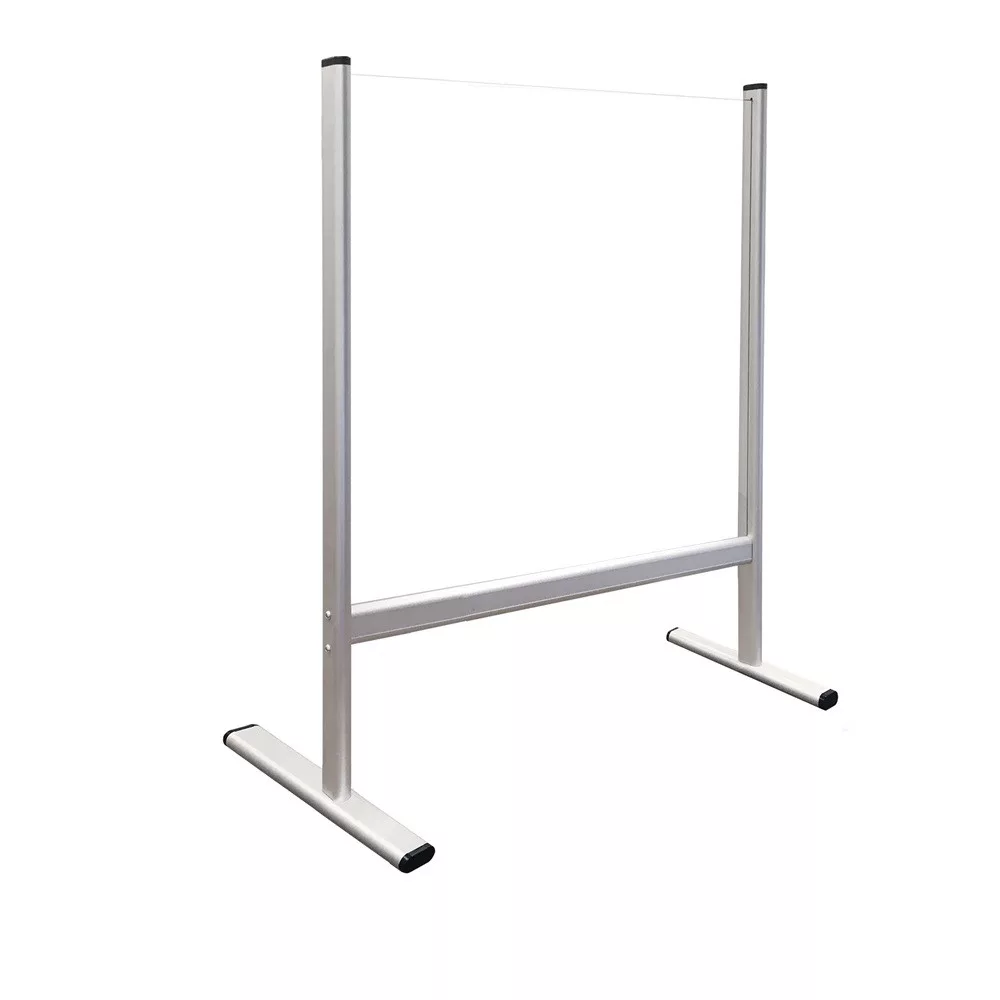 Pult és asztalosztó. Eloxált aluminium keret kereszt tartóval, mely garantálja a stabilitást. Hordozható, 20 cm kivágás az alján a tárgyak, dokumentumok átadásához. Átlátszó, könnyen tisztíható és fertőtleníthető. Teljes magasság: 92,7 cm. Egyszerű, gyors összeszerelés. Méret: 62,9 x 92,7 x 42 cm. Katalóguskód: 30827