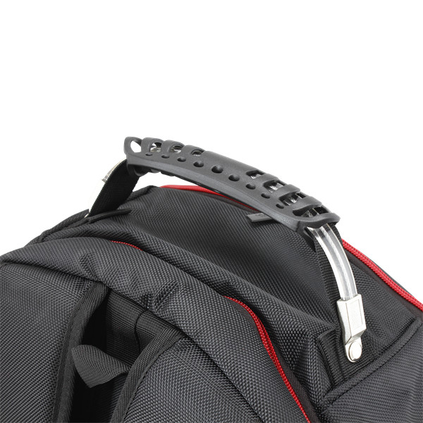 A metal-reinforced handle helps you carry this backpack full of gaming goods.