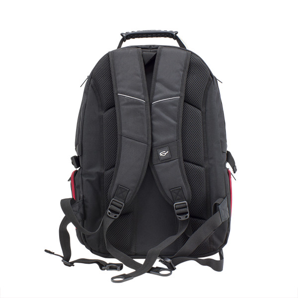 Two main separated compartments. Main one have padded pocket for 17.3" laptop with additional pocket while second one have one smalle padded pocke for smaller device like tablet + 3 mesh compartments for mouse, mousepad and personal belongings.