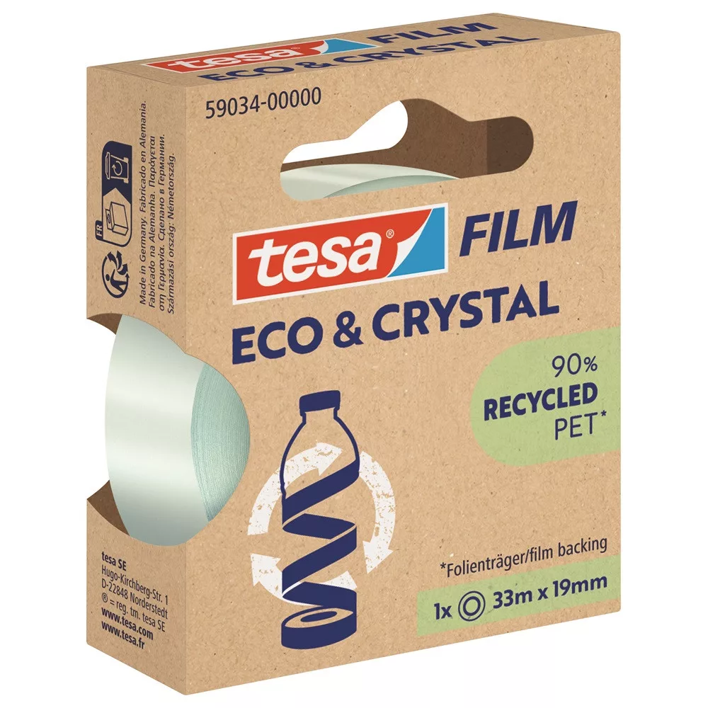 Bemutatjuk a tesafilm® Eco & Crystal szalagot, amely a klasszikus tesafilm® jól ismert tulajdonságait ötvözi a környezetbarát jellemzőkkel. Rendkívül átlátszó, sokoldalú, erős, oldószermentes ragasztóval, és 90%-ban PET-palackok újrahasznosításából származó műanyagból készült hordozóanyaggal. Ezenkívül a tekercs magja 100%-ban újrahasznosított műanyagból készül, és csendesen letekerhető. Az összes tesafilm® szalagadagolóval kompatibilis.